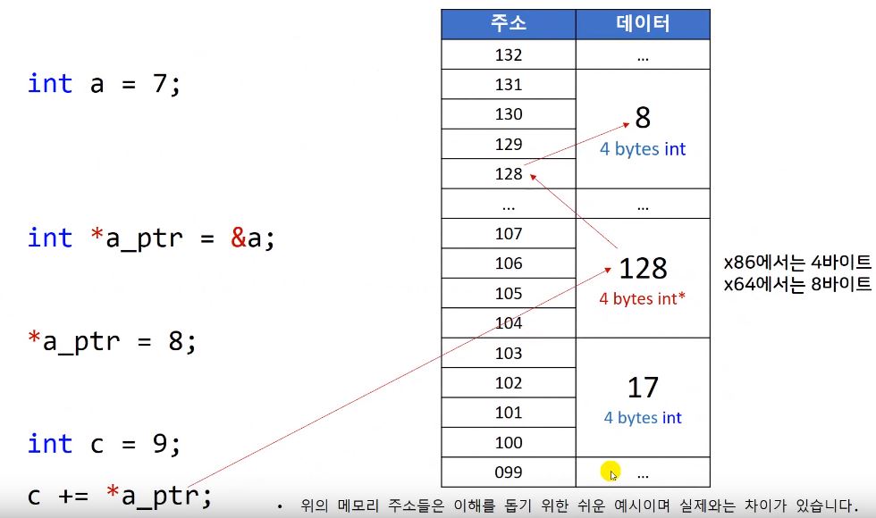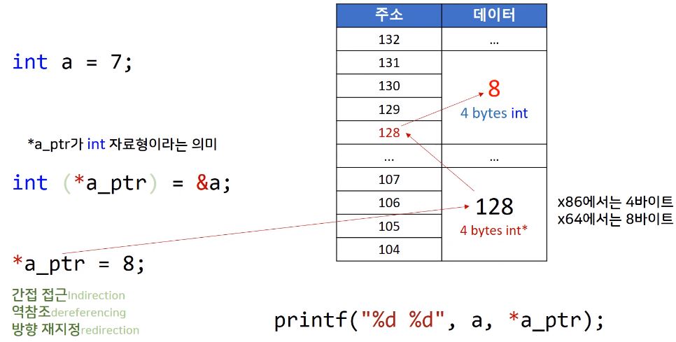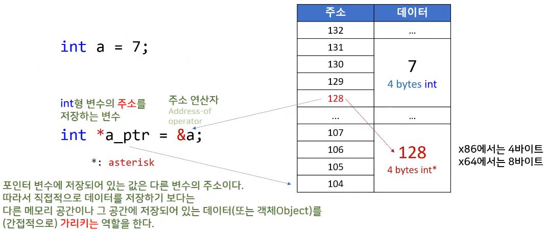 주소값을 저장하는 변수를 선언할땐 *(asterisk)를 붙인다. (a의 주소가 128이니 *a_ptr엔 값으로 128이 저장된다)