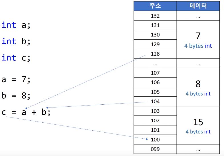 실제 컴퓨터 내부에서는 a라는 변수의 주소 128로 시작해서 131에 끝난다. 그 공간에 7이라는 데이터를 저장.
