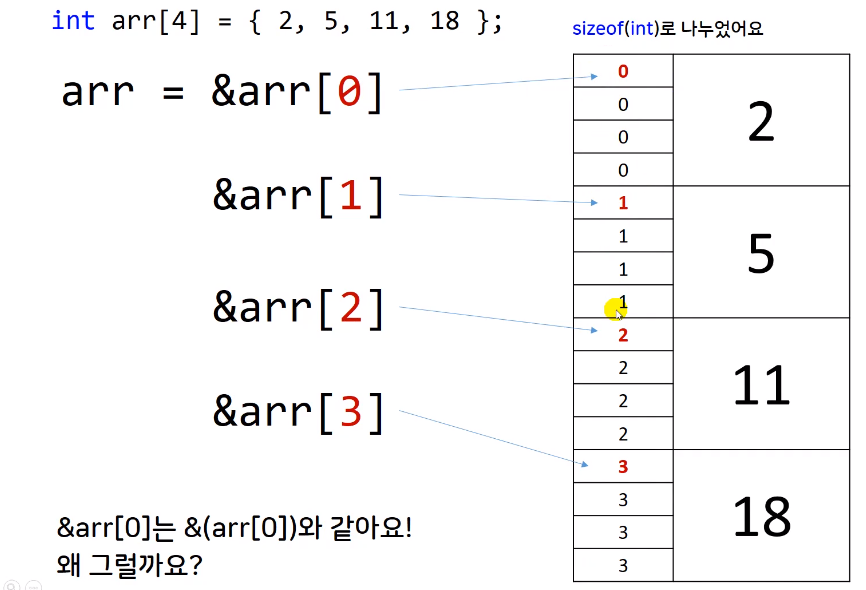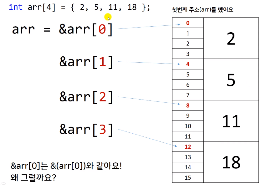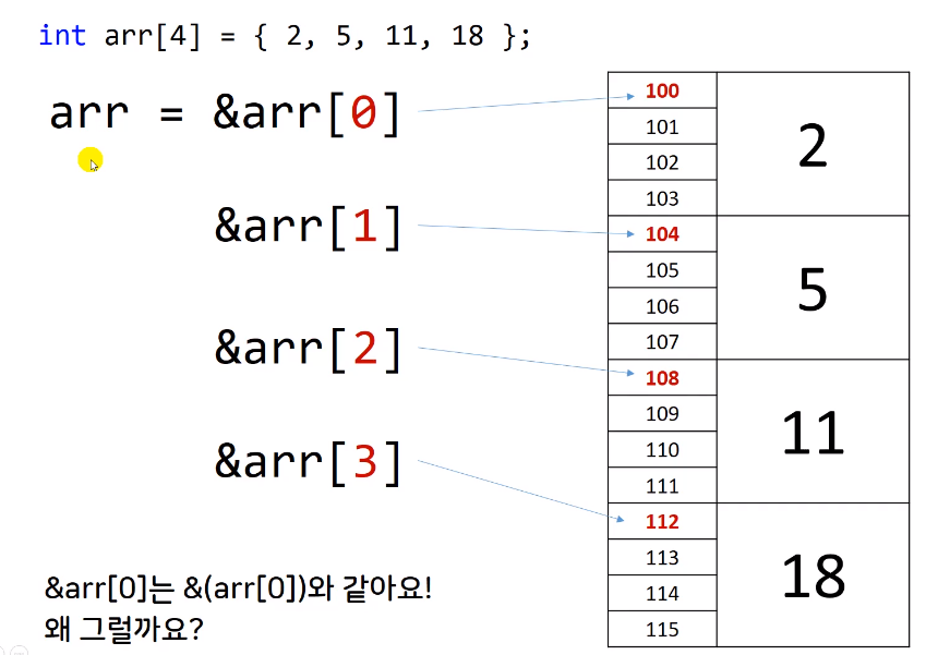&arr[0]과 &(arr[0])에서 () 소괄호의 우선순위가 &보다 크기때문에 &arr[0]과 &(arr[0]) 둘이 같다.