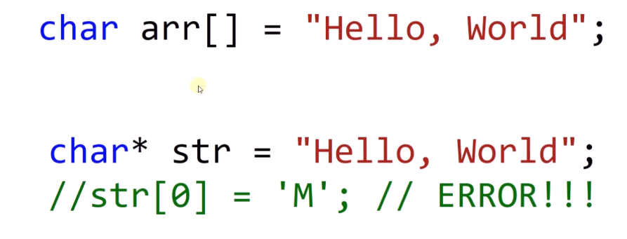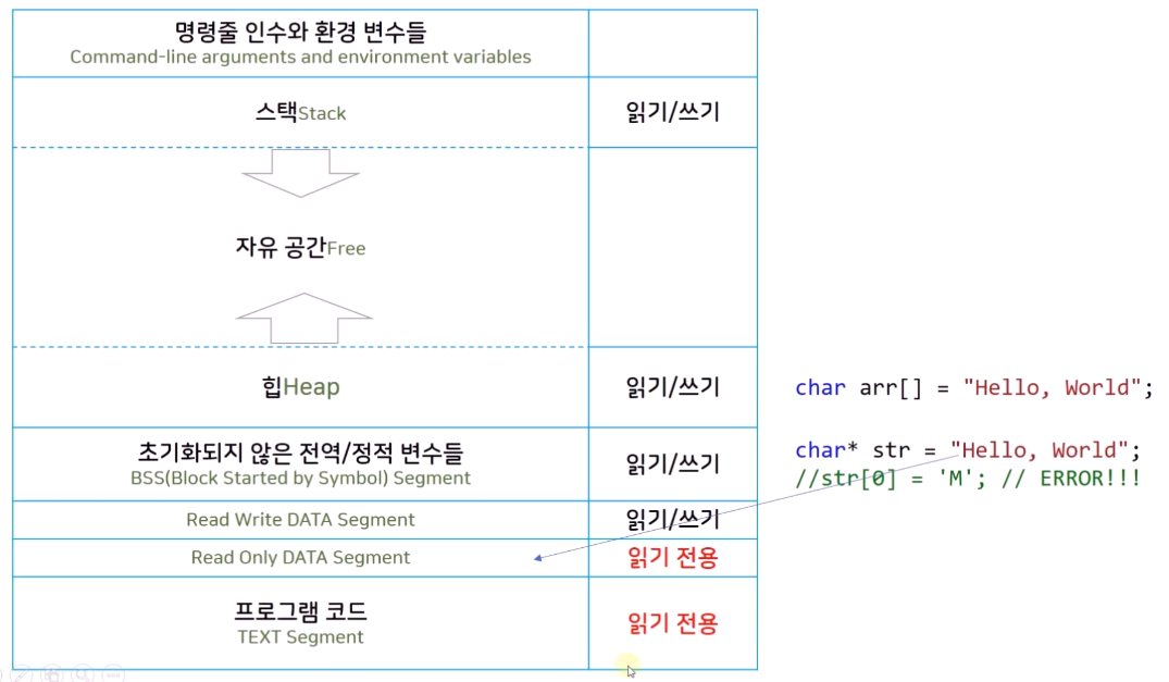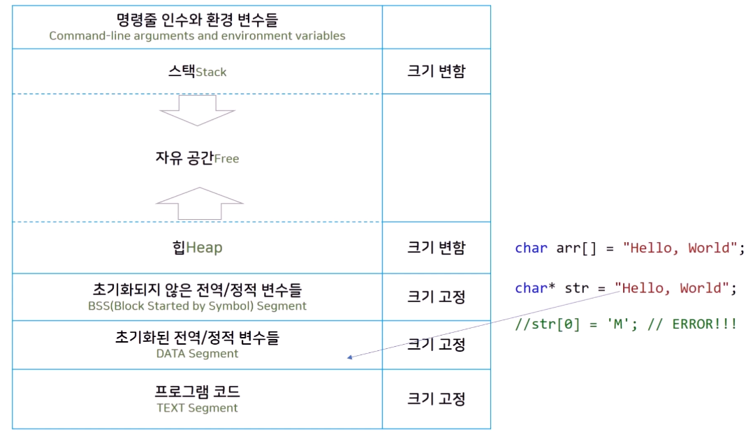 char* str = "Hello, World"; str 포인터는 "Hello, World" 스트링 리터럴이 저장되어 있는 공간을