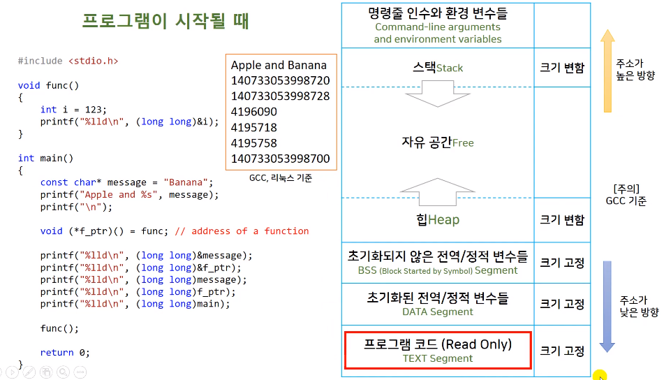 전역변수는 빨간 박스 안에 들어가있고 프로그램이 끝날때까지 계속 메모리에 머물러 있다.