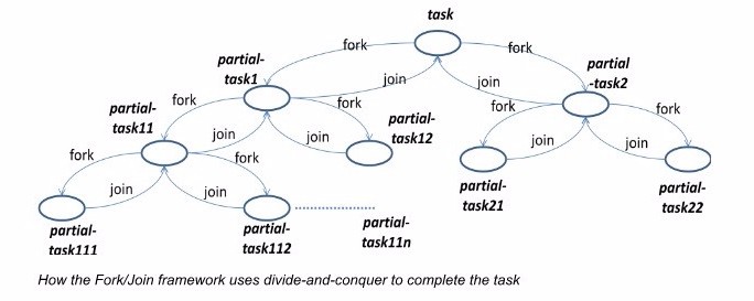 Java는 Quicksort 및 Mergesort와 같은 재귀분할 - 정복 알고리즘과 함께 사용되도록 설계된 버전 1.7 API에 fork join 라이브러리를 도입하였다. 이 라이브러리를 사용하여 분할-정복 알고리즘을 구현할 때 분할 단계 동안 별도의 작업이 fork 되고 원래 문제의 작은 부분집합이 할당된다.