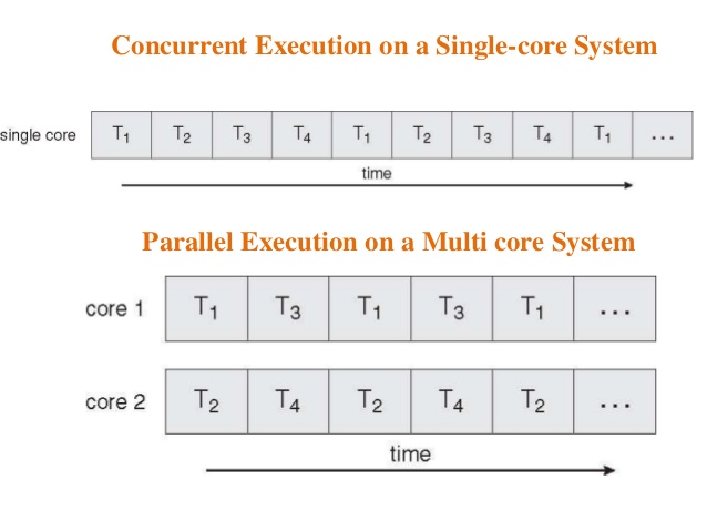 각 코어는 운영체제에 별도의 CPU로 보인다. 이러한 시스템을 다중 코어라고 하며 다중 스레드 프로그래밍은 이러한 여러 컴퓨팅 코어를 효율적으로 사용하고 병행성을 향상시키는 기법을 제공한다.
