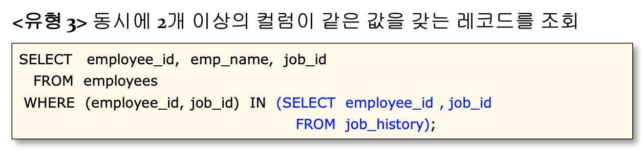 IN앞에있는컬럼의갯수와유형이서브쿼리에서반환하는컬럼의개수, 유형이 모두 같아야 함.