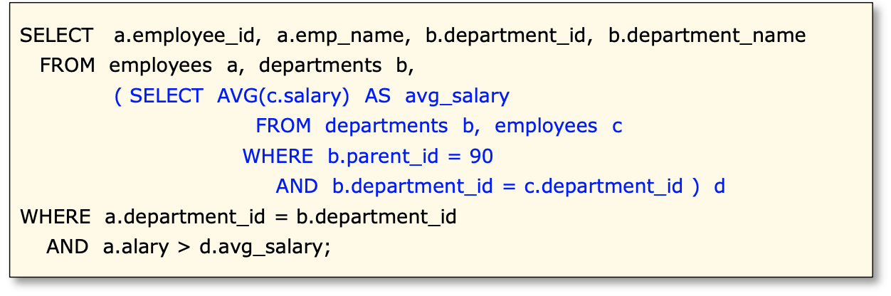 서브쿼리에서평균급여를구한뒤, 메인 쿼리에서 평균값보다 큰 사원을 조회함.