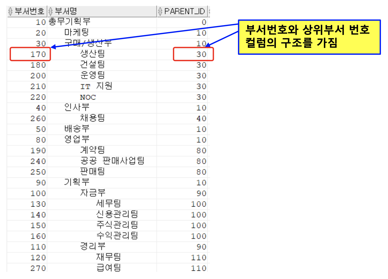 <예> 부서 테이블은 parent_id에 상위 부서 정보를 가지고 있음