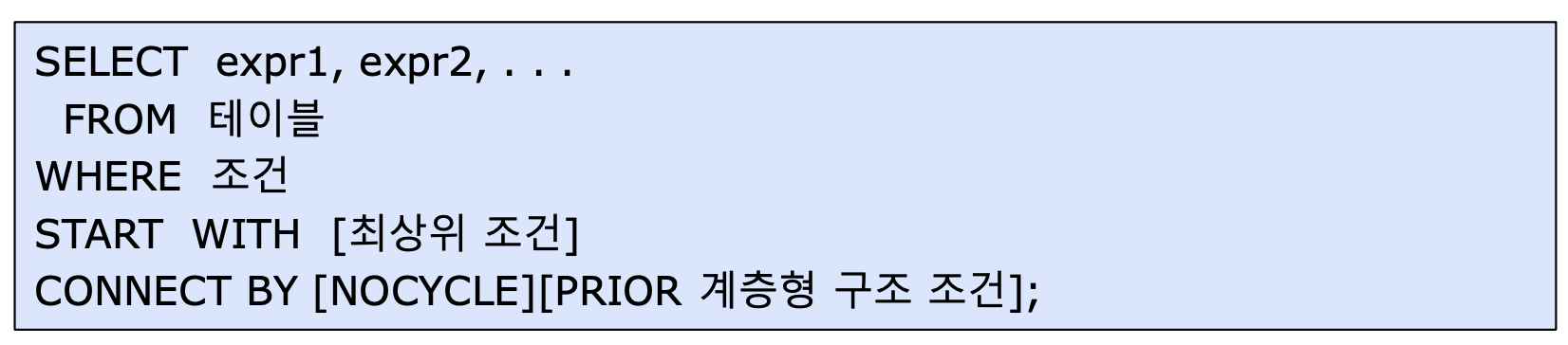 SQL을 사용해서 데이터 트리를 만들기 위한 오라클 만의 독특한 방법이며, Start with와 Connect By 구문을 가진다.