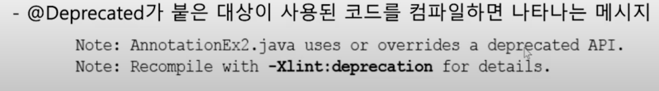 - 이 애너테이션이 붙은 대상은 다른 것으로 대체되었으니 더 이상 사용하지 말아달라 (권고)