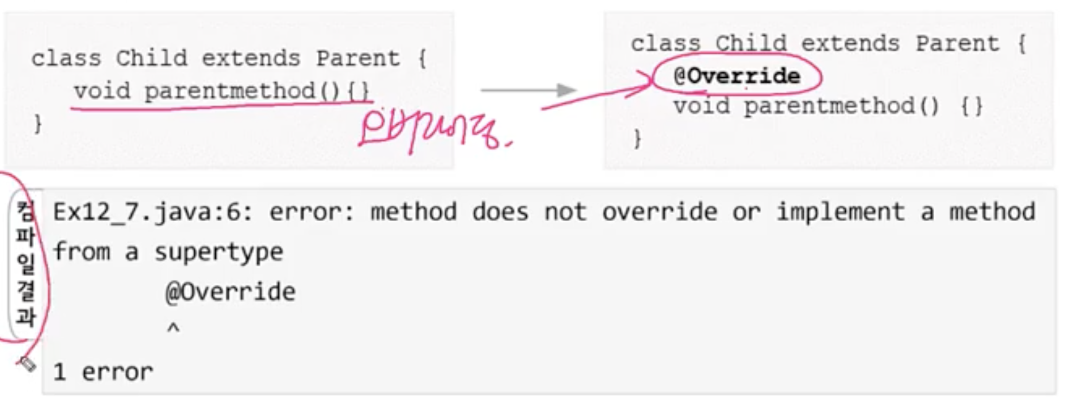 - 오버라이딩할 때 메서드 이름을 잘못적는 실수를 하는 경우가 많다.