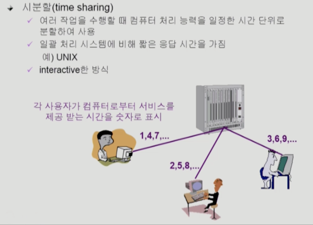 - 여러 작업을 수행할 때 컴퓨터 처리 능력을 일정한 시간 단위로 분할하여 사용
