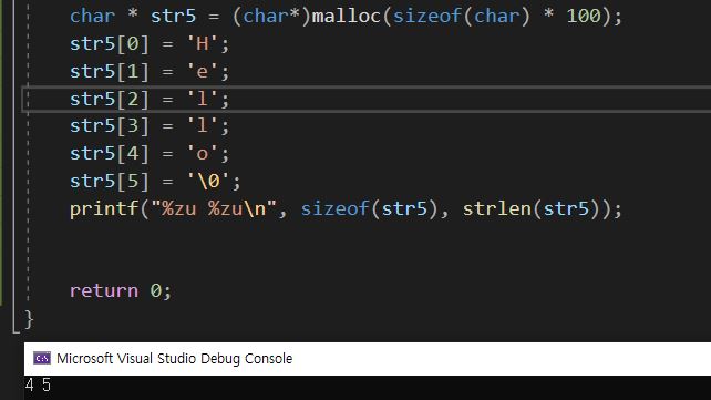 본래 Hello에 null charater가 들어가 6이 되어야 하는데 5이다.